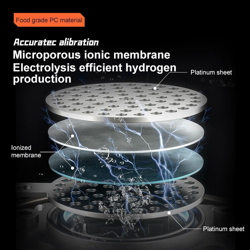 The Q12 hydrogen water generator makes the water in a high hydrogen concentration from 900ppb-2300ppb,ORP from -200mV to -600mV.Most Important,with its high quality of USA DUPONT N117 membrane,it puts only pure H2 into the water. Oxygen, Ozone and Chlorine are separated out. So the hydrogen water you get is 99.99% pure H2 and NO Chlorine,No Oxygen,No H2O2,NO Ozone. Able to attach disposable plastic drinking water bottles,portable for travel,work and office. Any kind of water can be used:Mineral Water,Pure Water,and Distilled Water is welcomed.Additionally,this machine uses PEM and SPE technology to make pure 99.99% H2 hydrogen.