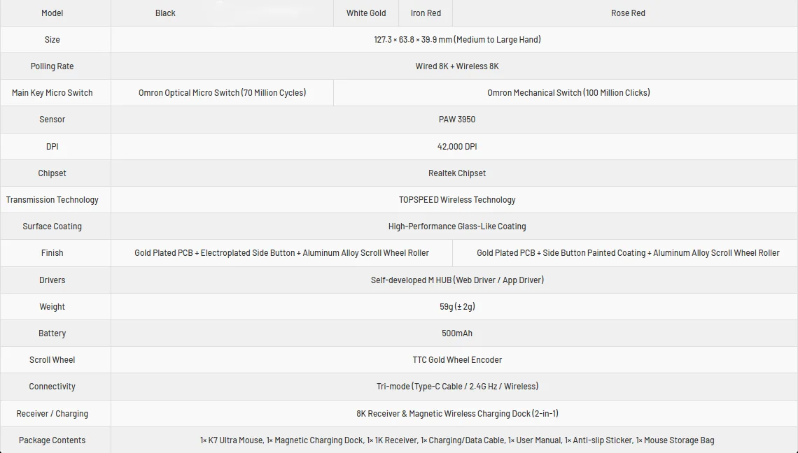 The MCHOSE K7 Ultra is our first tri-mode gaming mouse equipped with a magnetic wireless charging dock. Featuring the PAW3950 sensor, 8000 Hz polling rate, proprietary wireless technology, and an ultra-lightweight design, every element is engineered for competitive domination.